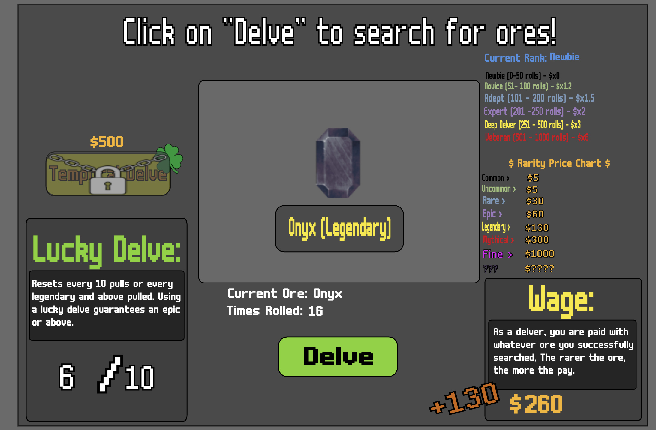 - Click "Delve" to roll one time in order to obtain one random mineral with varying rarities.